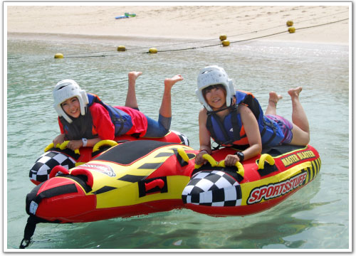 うつ伏せタイプの2人乗り。(3人乗り)遠心力で楽しむスリル満点のマリンスポーツです。ひざ下で水しぶきを感じられます。